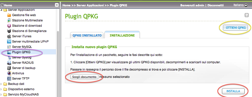 Devi andare in ->Server Applicazioni ->PluginQPKG ->Installazione