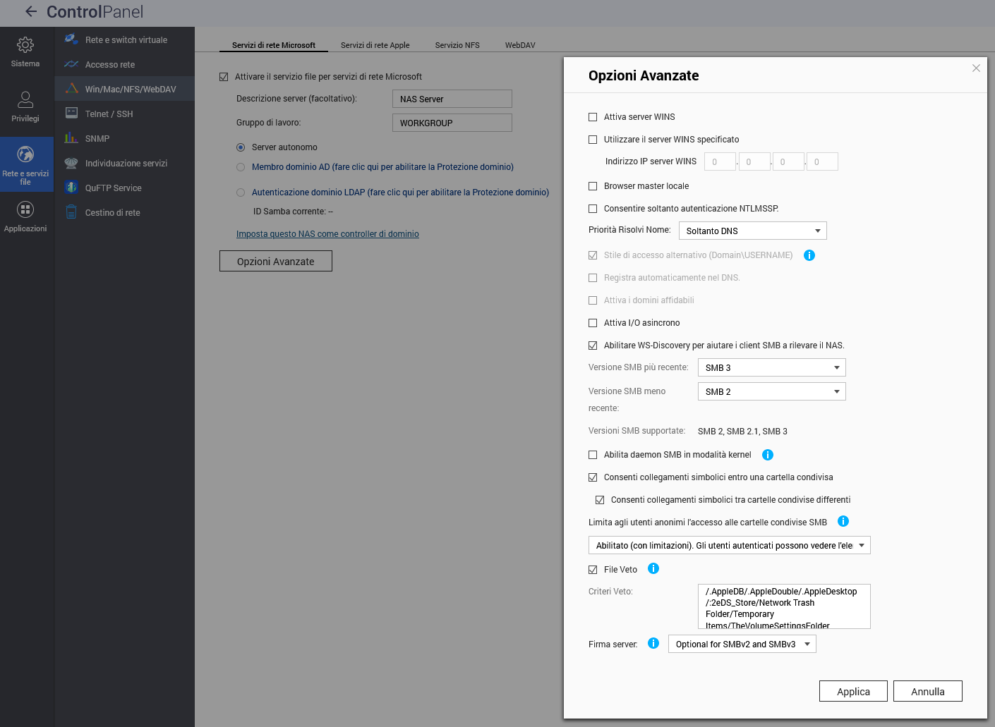 Ciao afrim, per quanto riguarda le tue opzioni avanzate, credo che non si abbia la possibilità di cambiare protocollo come nel nuovo OS QTS (come