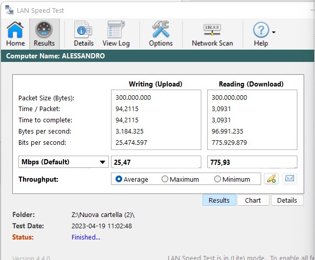 Purtroppo però sto avendo problemi di velocità. In particolare per quanto riguarda la scrittura. Allego un test effettuato con LAN Speed Test con file da 300mb dove si evince che la velocità media è di 25,47 mbps.