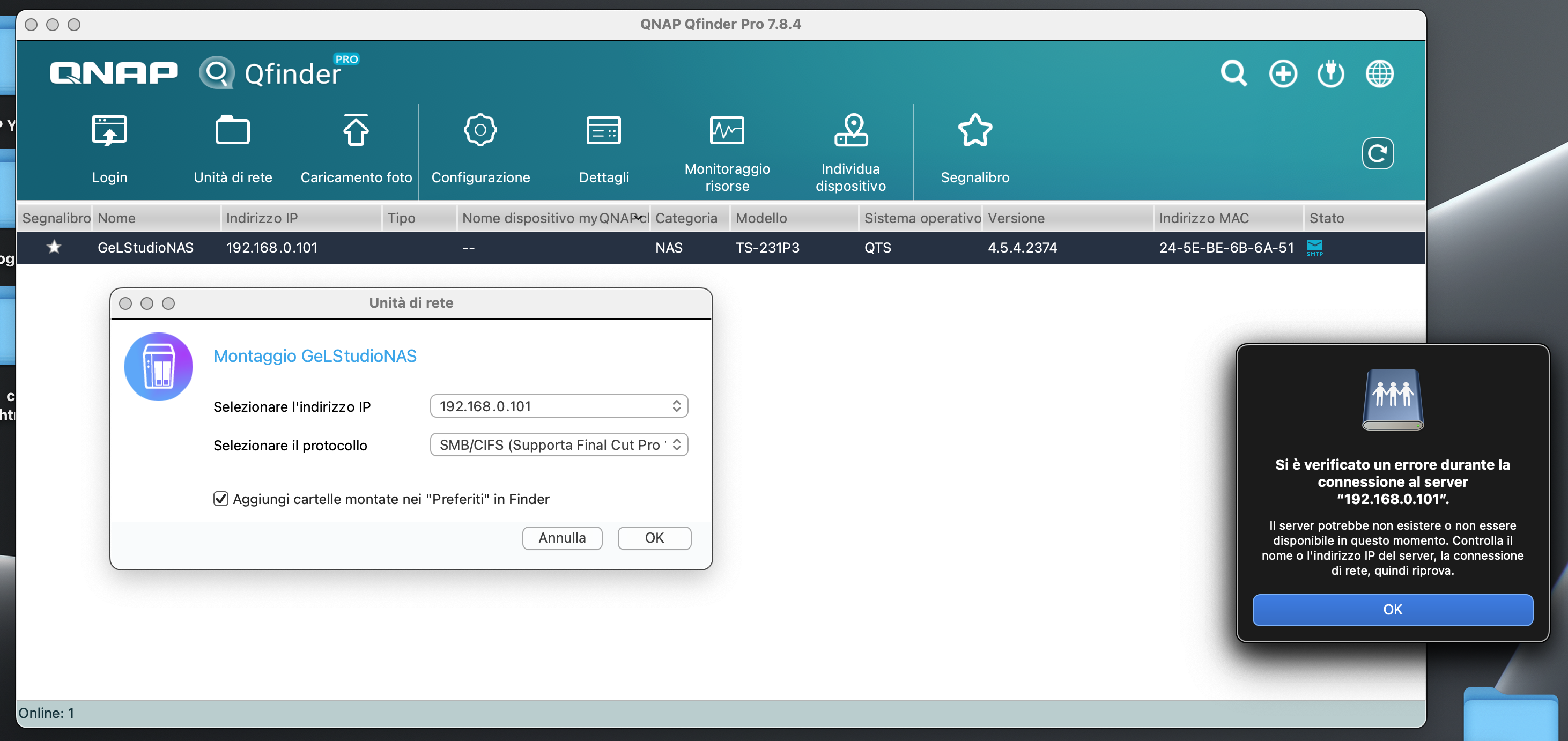 Ho installato il NAS QNAP231P3 seguite le configurazioni, e al momento di vederlo sul mac errore via allego screen