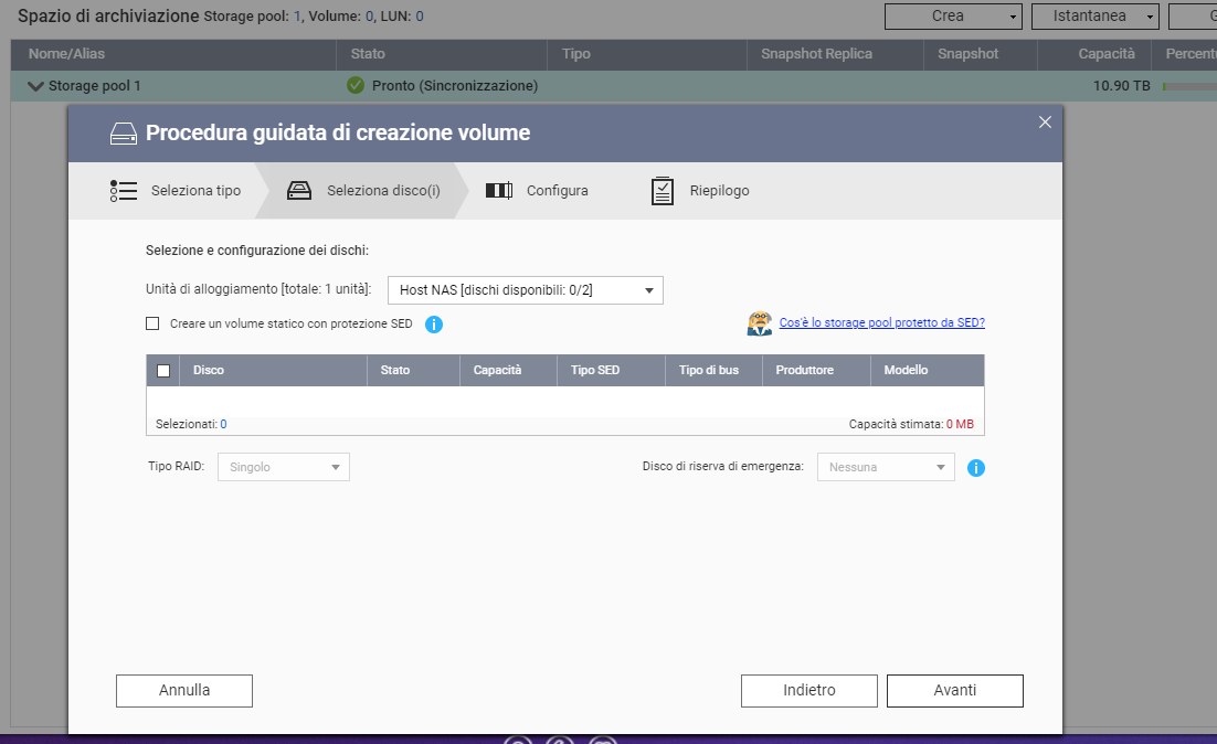 Ho dovuto re-inizializzare il NAS per problemi tecnici. Ho creato lo Storage Pool (che sta ancora in sincronizzazione). Stavo per creare il Volume Statico ma la finestra che dovrebbe permettermi di crearlo non mi seleziona nessun disco.