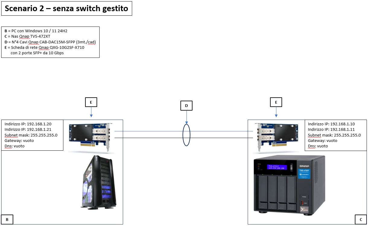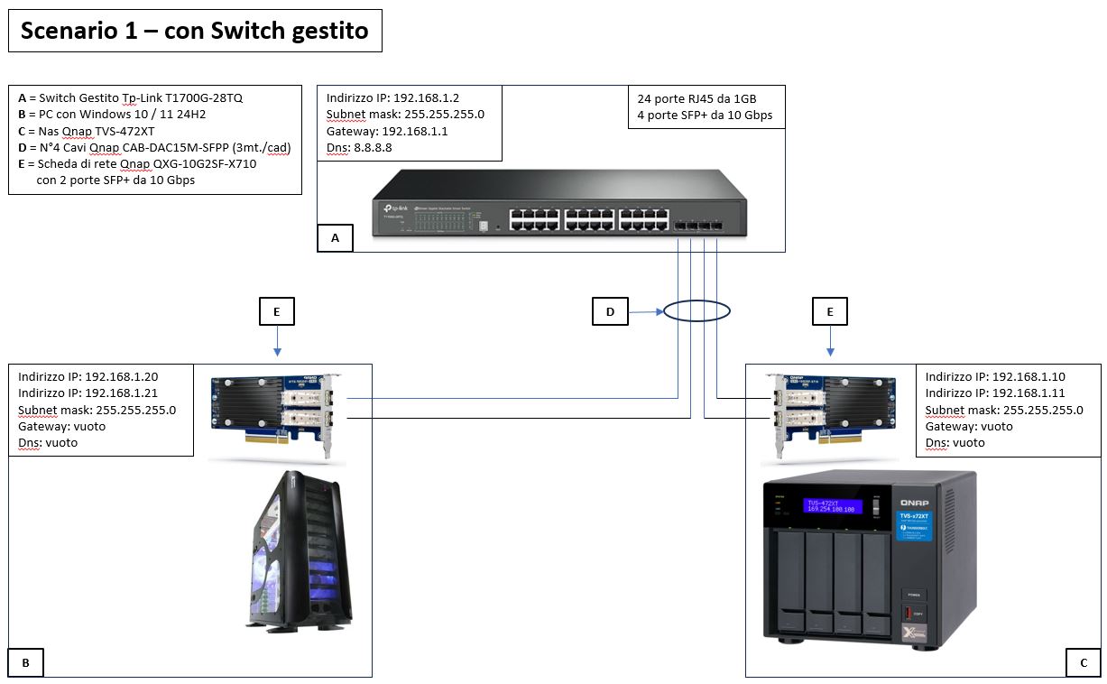 "Scenario 1: con Switch gestito" usando tutte e 4 le porte SFP+ da 10G, 2 cavi provenienti dal PC e gli altri 2 dal NAS