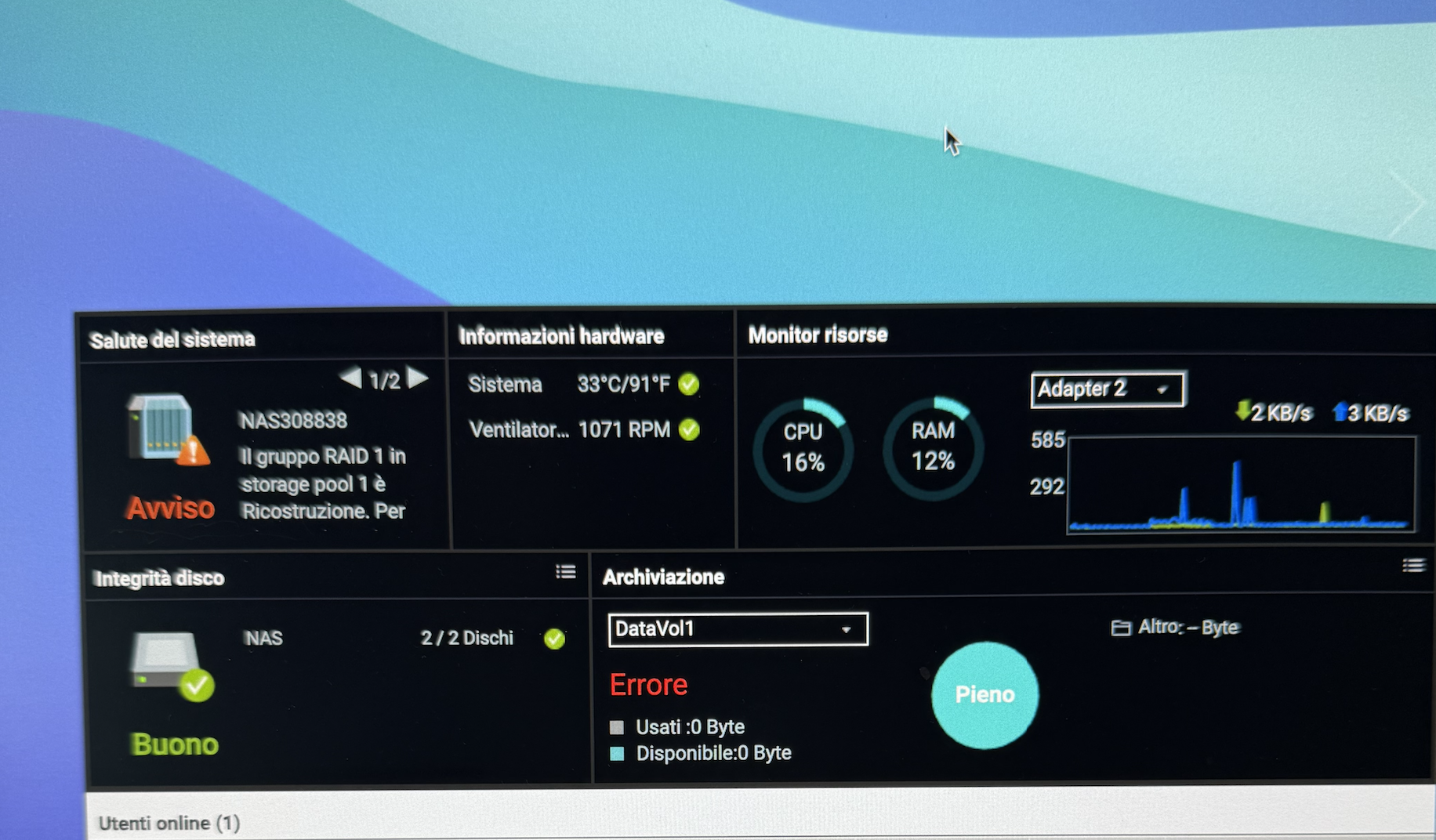 ciao a tutti, ho un nas qnap TS-253Be con inseriti due dischi WD40EFRX 4 TB, da 5 anni mai avuto un problema ha funzionato ininterrotamente 24 ore su 24 per 5 anni da ieri continui messaggi acustici spia rossa che appare e poi sempre spia verde che lampeggia e ogni minuto piu' segnale acustico,
