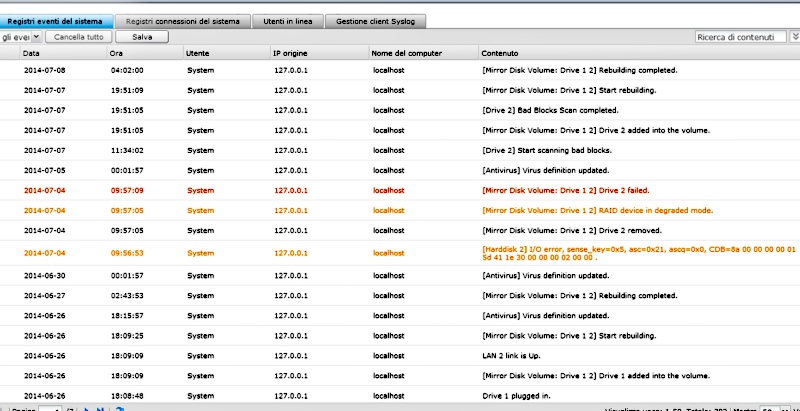 Rimesso sul NAS ha ricostruito il Raid 1, ma dopo una settimana il problema si è ripresentato uguale (vedere sreenshot allegato). Scansione, nessun problema ricosntrato, array ricostruito, passati altri 10 giorni, stesso warning (siamo alla 5' volta...).