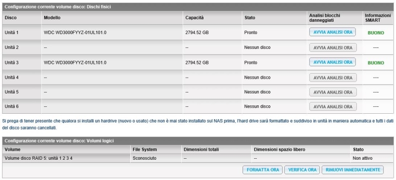 da qualche giorno la mia TS-669 Pro di punto in bianco non riconosce piu due dischi su quattro! Ho Provato a riavviare più volte e a macchina spenta ho pulito contatti/backplane. La cosa stana che non rileva lo slot 2 e 4 sia da display frontale che da web admin, ma il led frontale mi segna verde. La release di firmware è vecchia, 3.8.1 Build 20121205 non ho provveduto a fare aggiornamenti perchè ho dati fondamentali (4/5Tb) e senza backup non mi sono mai fidato di farlo.