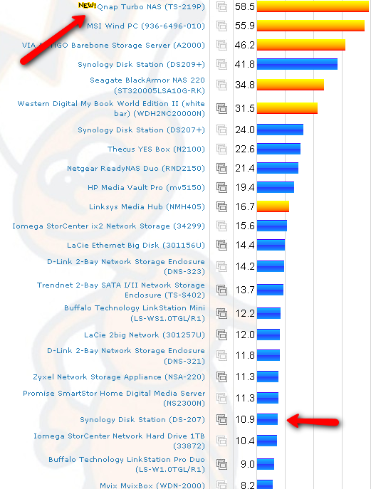 Come puoi vedere dalla tabella qui sotto, le prestazioni della precedente generazione di NAS a 2 bay (ti ho indicato l'equivalente 207 della Synology xchè il 209 non è stato testato da smallnetbuilder) sono ridicole in confronto al nuovo TS-219, tanto x rimanere in casa QNAP: