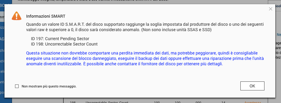Poi ho fatto un test di controllo completo del disco, che l'ha completato senza errori, segnalandomi però nel registro questo messaggio: