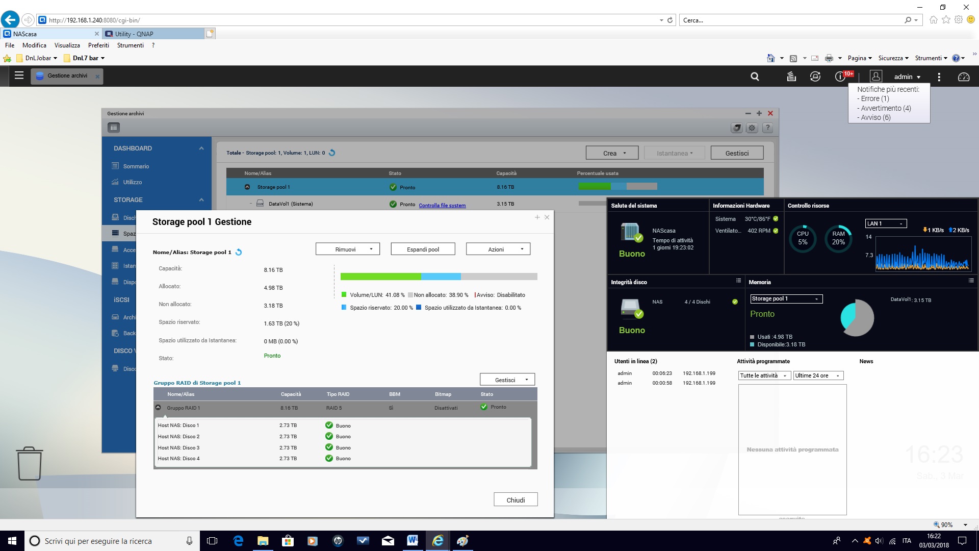 confermo, quei "poco più di 8Tb" sono in effetti 8,16Tb. Leggo però nel Dashboard che ho disponibili solo 3.18Tb e che ci sono 4.98Tb usati (io devo ancora iniziare ad inserire dati nei dischi), allego immagine: