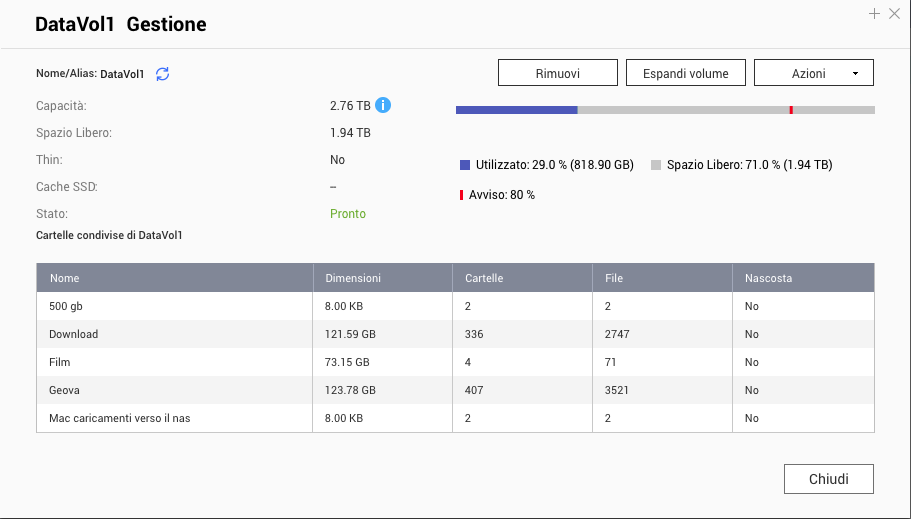 I 4Tb formattati (a cui togli anche lo spazio occupato dal QTS) corrispondono a quei 3.63 che vedi nella terza schermata postata. Lo spazio riservato alle istantanee è 740Gb.... se fai la somma torna tutto.