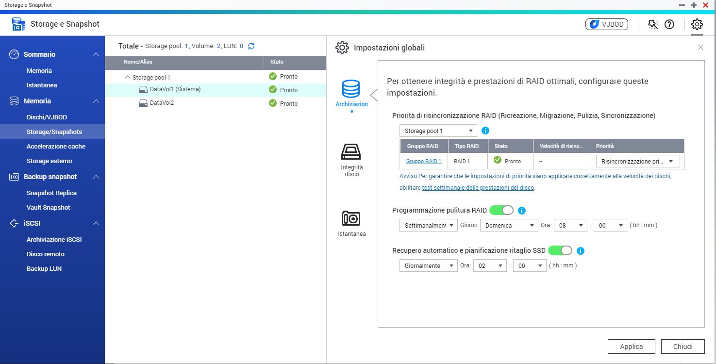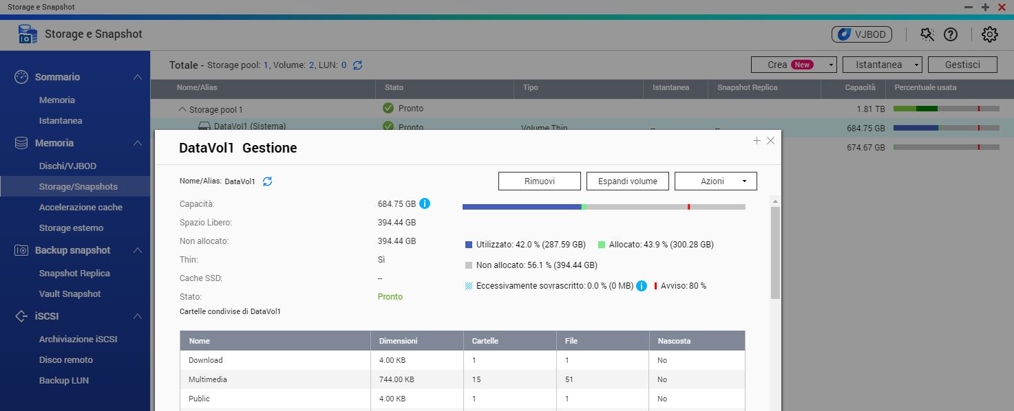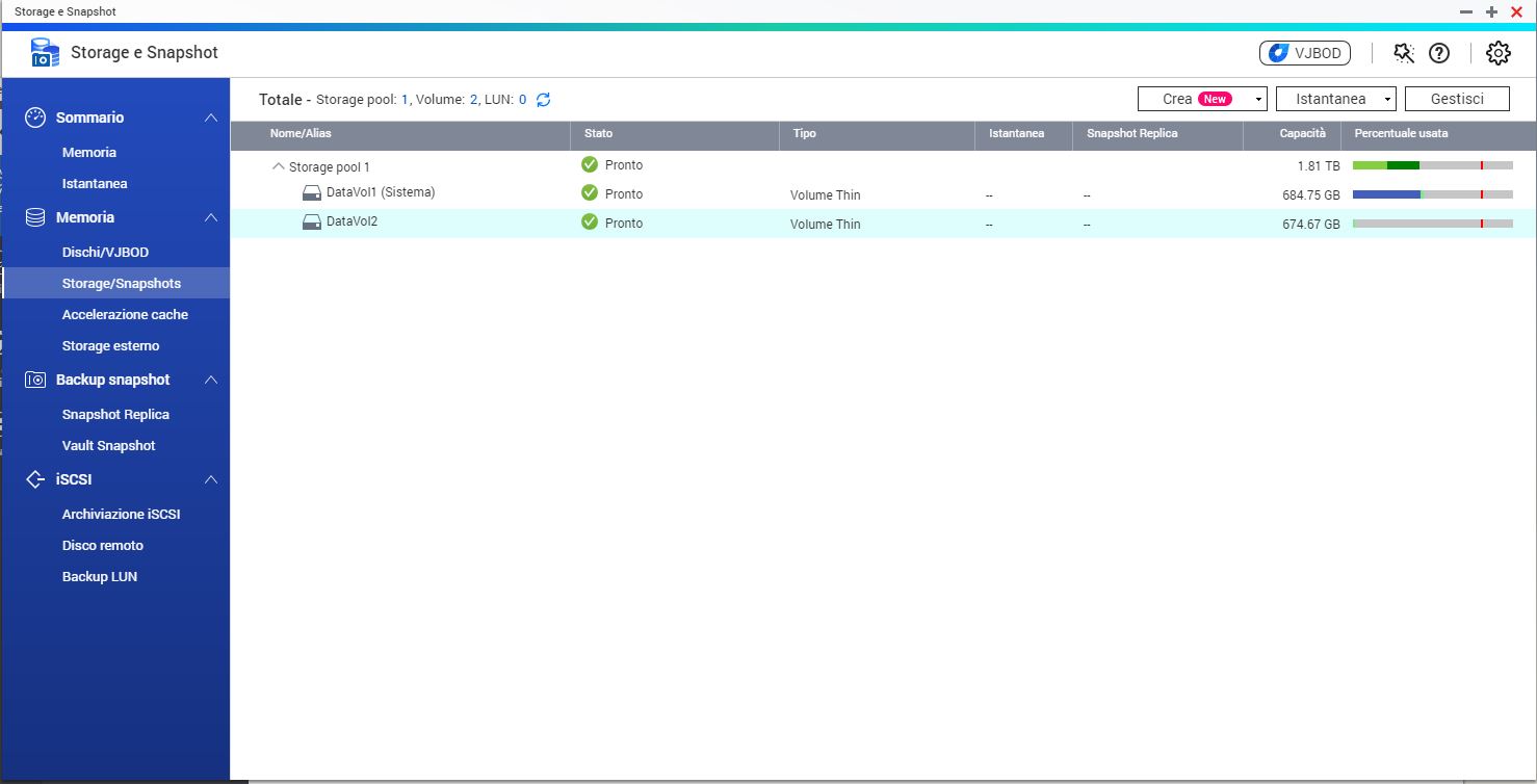 Posta la schermata di storage --> storage/snaps --> doppio click sul volume, tale da vedere il pool e lo stato dei dischi.