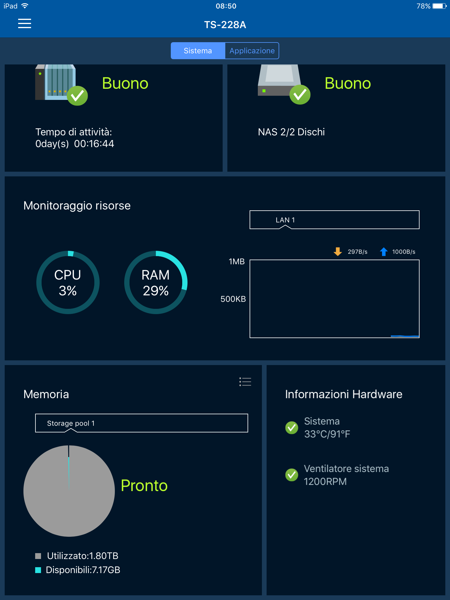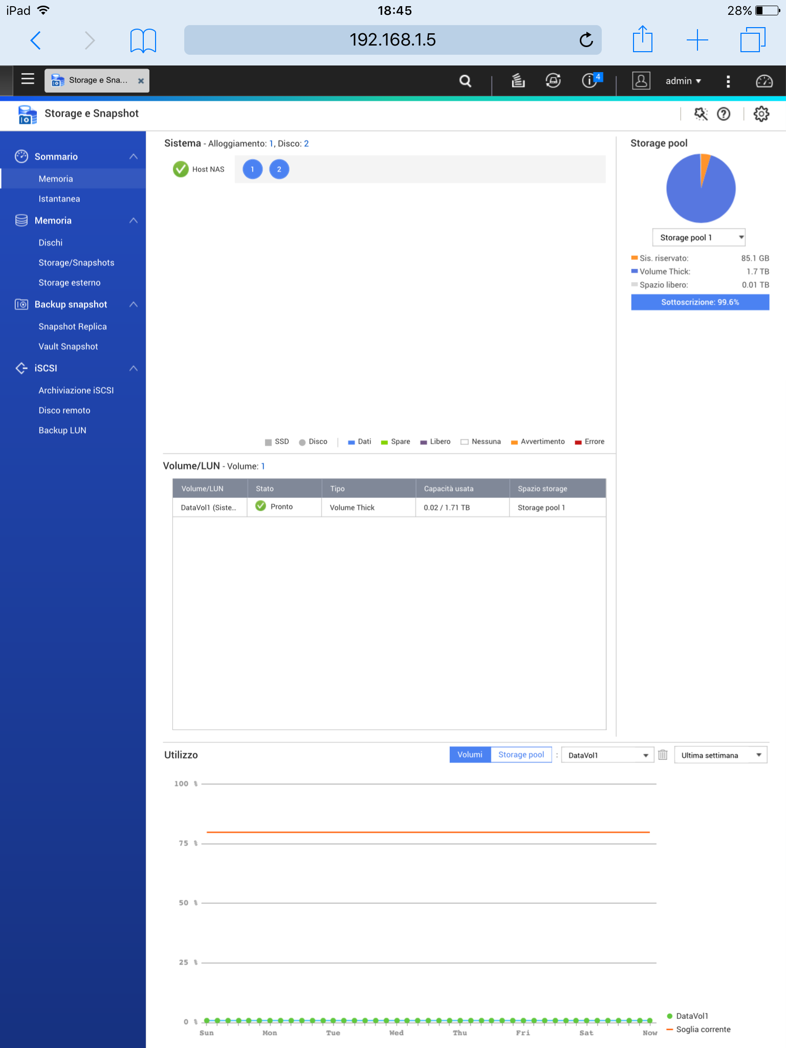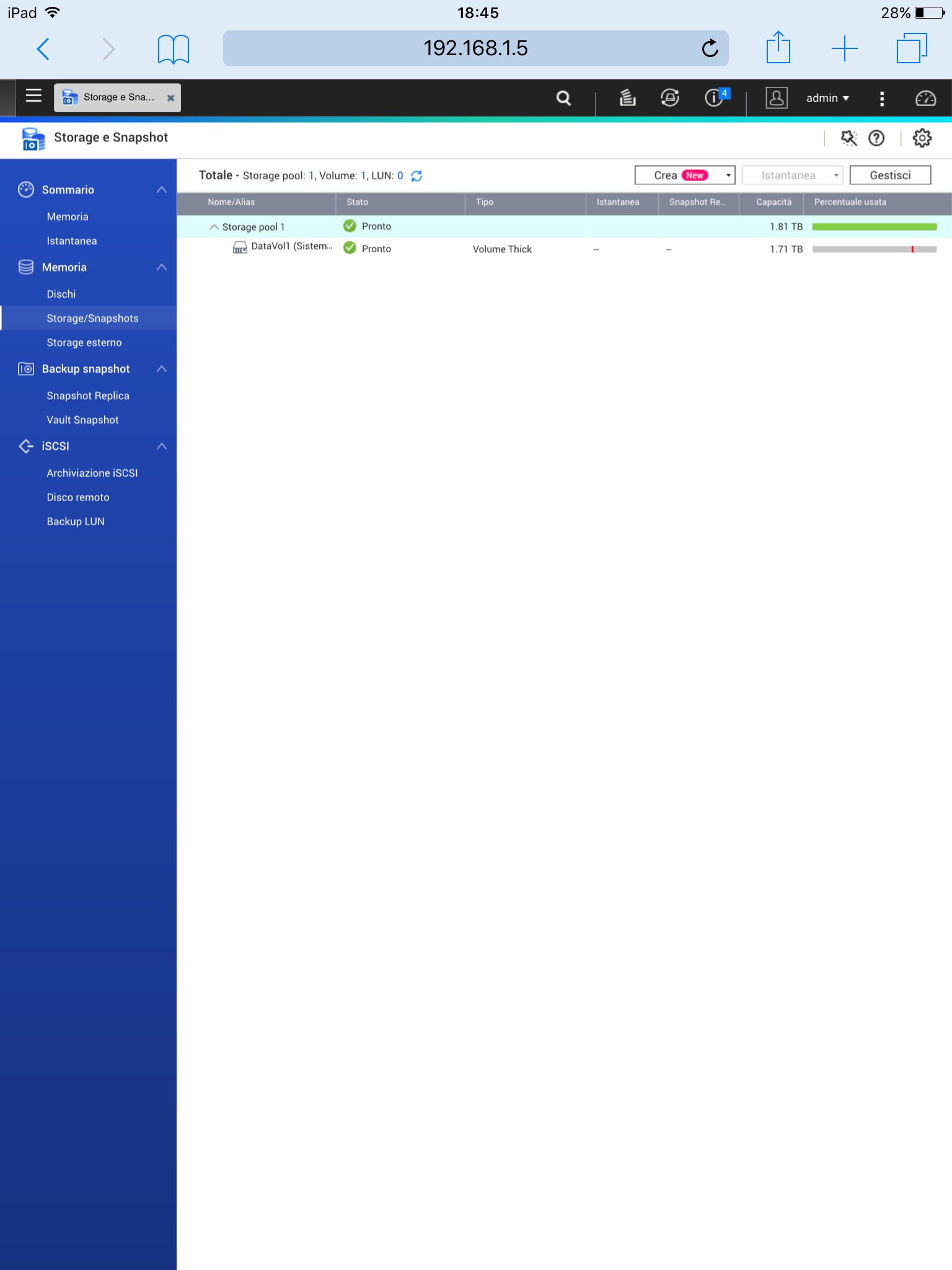 Studiando sul forum penso che i 2 dischi da 2 tera siano in raid1, e questo lo avevo richiesto a chi me l'ha venduto, dagli screenshot che allego invece credo di non avere la possibilità di utilizzare le snapshot in quanto lo spazio "gestito" è pari al 100% di quello disponibile, vero?