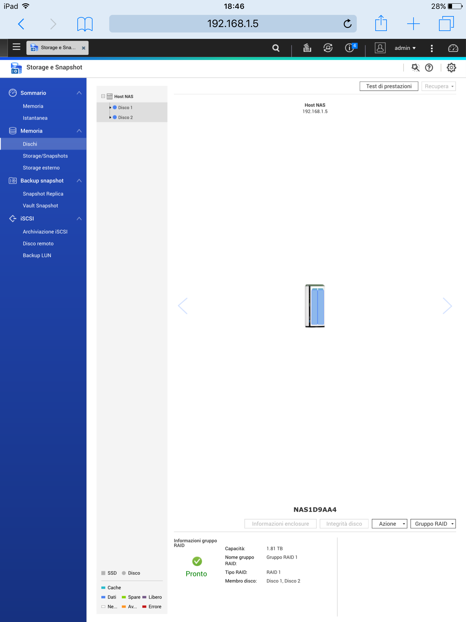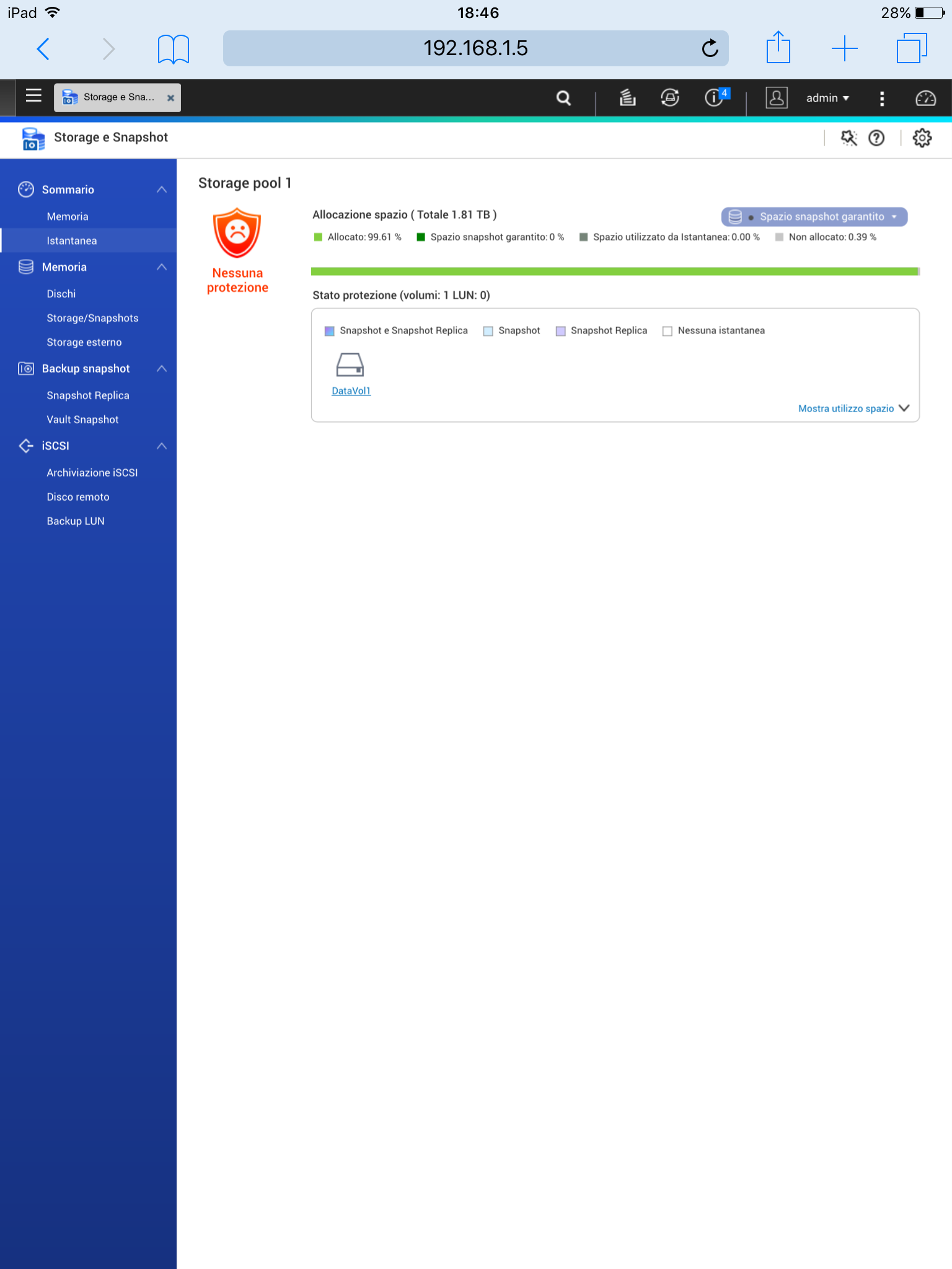 Studiando sul forum penso che i 2 dischi da 2 tera siano in raid1, e questo lo avevo richiesto a chi me l'ha venduto, dagli screenshot che allego invece credo di non avere la possibilità di utilizzare le snapshot in quanto lo spazio "gestito" è pari al 100% di quello disponibile, vero?