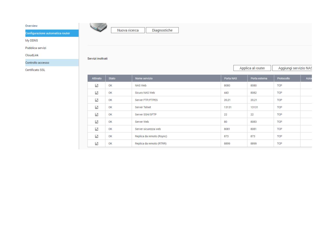 Verifica sul NAS quale porta esterna è indirizzata alla 8080 interna (se nessun dispositivo ha usato (o usa) la 8080 esterna, verrà usata quella, altrimenti nella tabella Config Autom Router vedrai quale porta è usata).