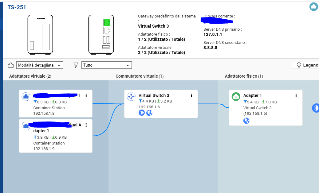 in entrambi i casi la rete era strana, come vedi non si vedono gli adattatori, e dal menu Reti & Switch manca tutto. Ho rinizializzato il NAS TS251 (tanto l'HDD era vuoto) ed è tornato tutto a posto. Chiaramente farlo sul TS253Be dove ho 8 cam, vari utenti, 4 container formattare tutto mi scoccia non poco.