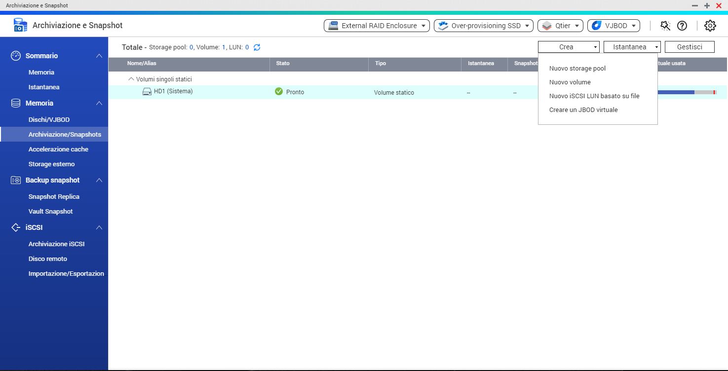 Crei un volume (statico, fai prima) sul disco nuovo (numero 1).