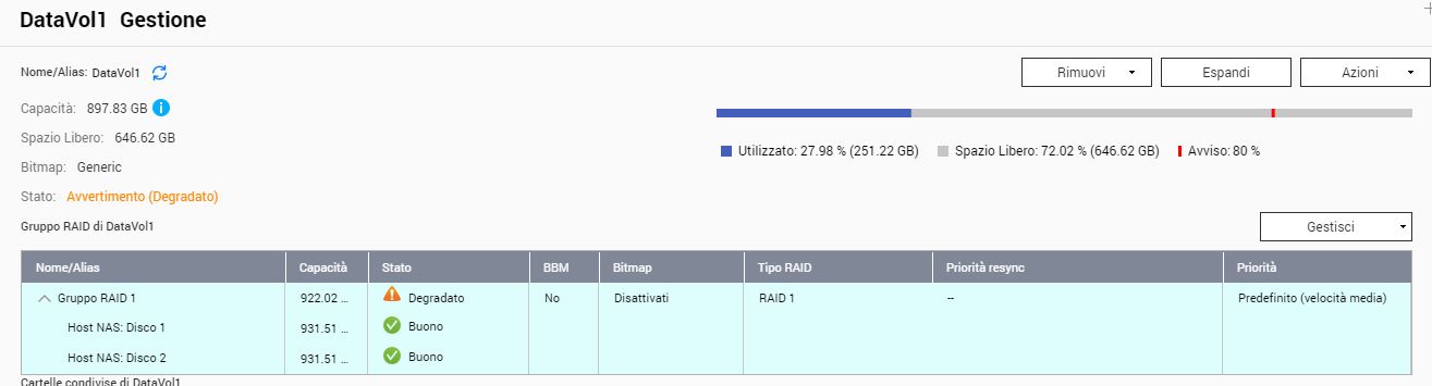 Questa mattina, connettendomi al NAS ho trovato un avvertimento piacevolissimo, gruppo RAID1 disco degradato,come da immagine.