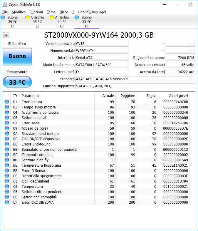 non credo di aver fritto 2 hd, tanto più che CrystalDiskInfom i dice che sono ok (l'immagine allegata è del disco 4 che ho tolto e che ho connesso al pc per controllarla)