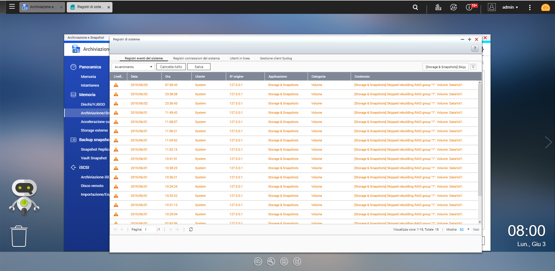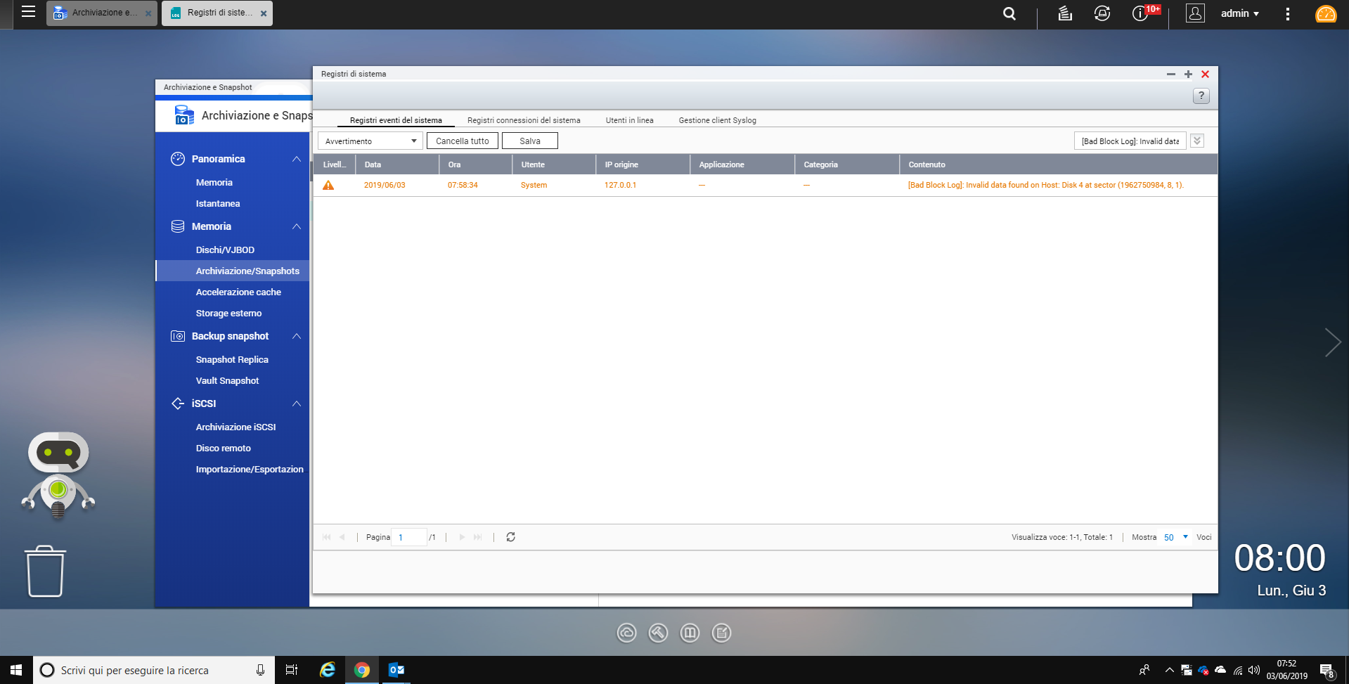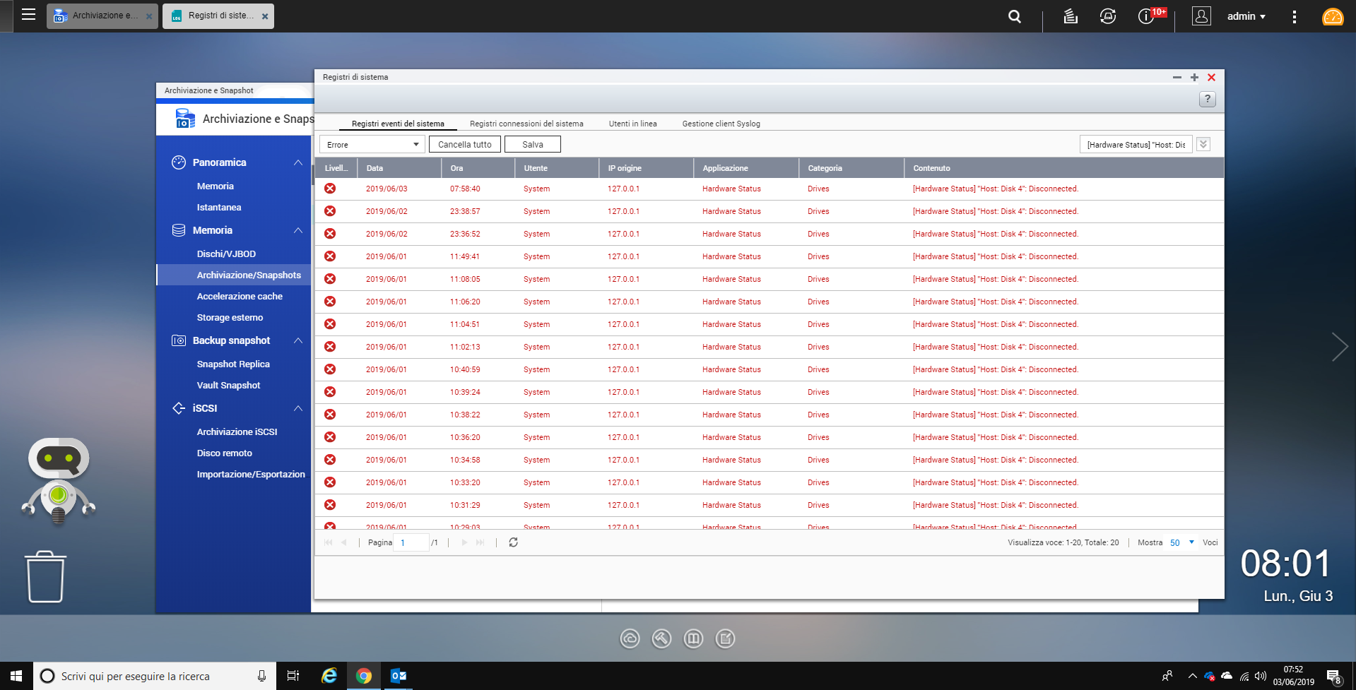 Per FFFAB: il test controllo completo dei due dischi ha dato esito negativo, per cui tutto è come prima. Ho anche aggiornato il firmware. Non so se è casuale, ma - dopo tre mesi - mi è riapparso l'avvertimento "Network and virtual switch interface - adapter 1 disconnected", che non ho ancora capito a cosa si riferisca. Quando avvenne a suo tempo, non riuscivo più a lavorare con Webdav e Qsync...anche in questo caso il tutorial non aiuta assolutamente.