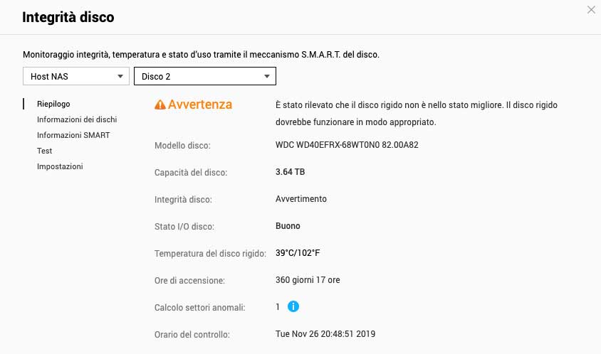 Lo stato del disco dice che è buono e il nas funziona perfettamente, ma rimane questo avvertimento