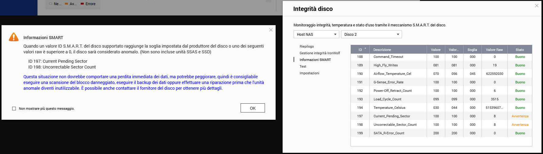 Ho poi solo provato a riavviare il NAS e il disco 2 incriminato è ritornato in buono stato con tutti i parametri corretti a zero.