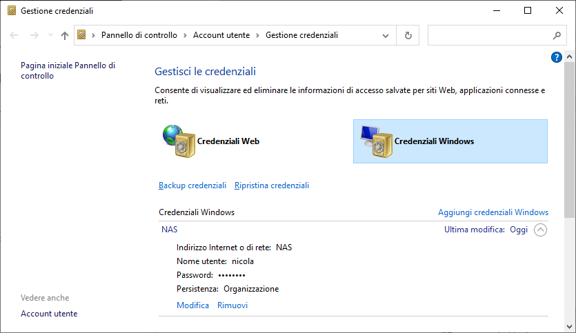 Usando il comando NET Use * /Delete nelal console di windows, mi dice che la connessione da annullare è \\NAS\IPC$ , probabilmente perchè fra le credenziali di windows c'è quello che vedete in allegato. Forse nelle credenziali non deve esserci il nas, ma le singole cartelle in uso dall'utente nicola?