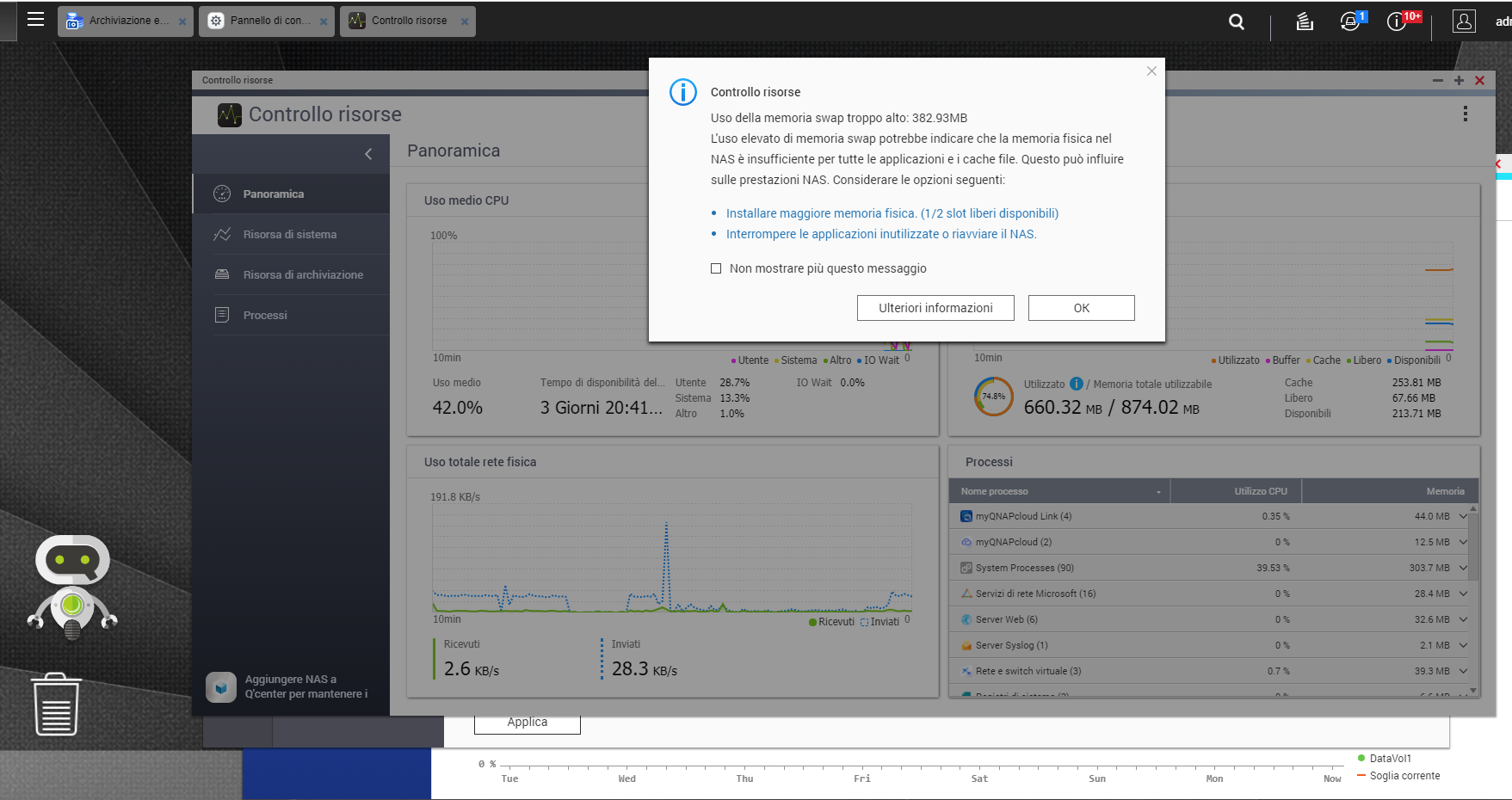 Hai poca memoria fisica (RAM) per i servizi/app attivi: il QTS ti avverte del calo prestazionale notevolissimo causato dell'eccessivo uso della memoria swap (su HDD/SSD). Aumenta la memoria se puoi, visto che il 251 regge fino a 8GB ufficialmente (16GB se vai fuori specifica).