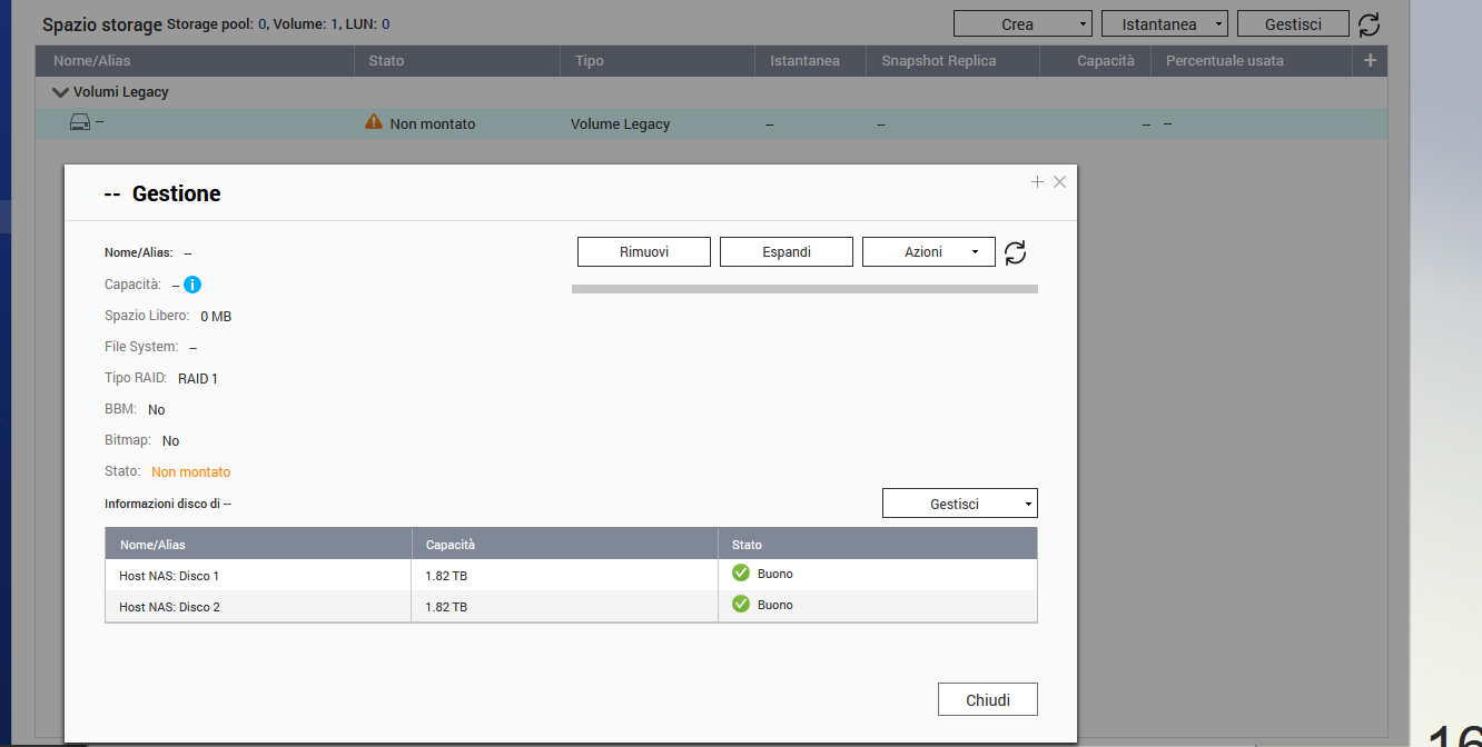 Accedo in amministrazione e mi dice che il volume non è montato. nonostante i dischi siano ok (allego screenshot)
