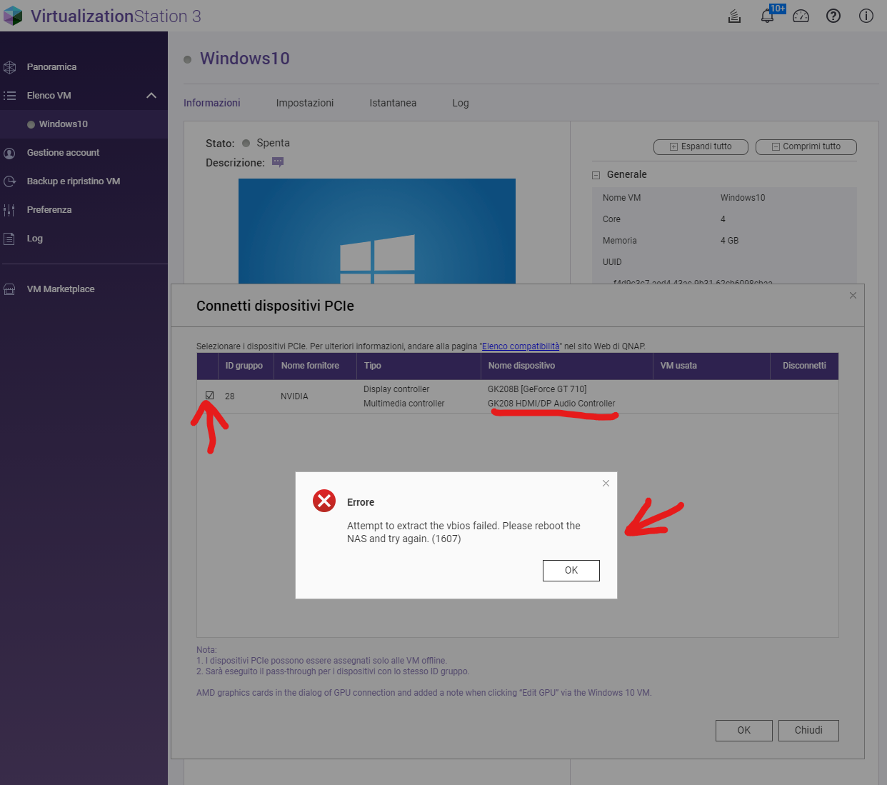 Il problema si verifica quando decido di assegnare la GPU tramite PCIe a Virtualization Station nelle opzioni PCIe, infatti mi dà:
