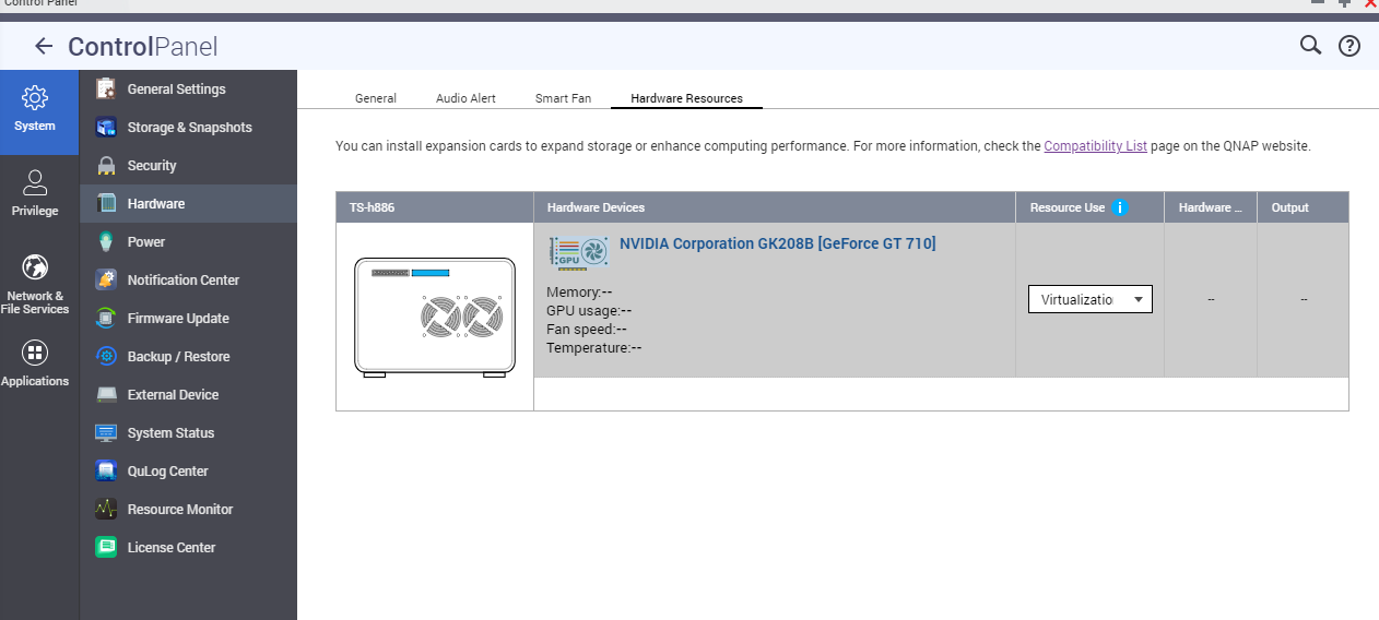 ho appena acquistato un QNAP TS-h886 (firmware h4.5.1.1472 più recente) su cui ho installato la nvidia gpu GT-710 nello slot di espansione.