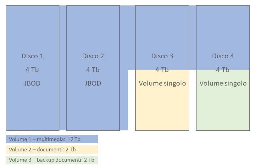 • volume 1: 2 dischi da 4 Tb + 50% dei 2 dischi successivi da 4 Tb -> archivio multimediale;