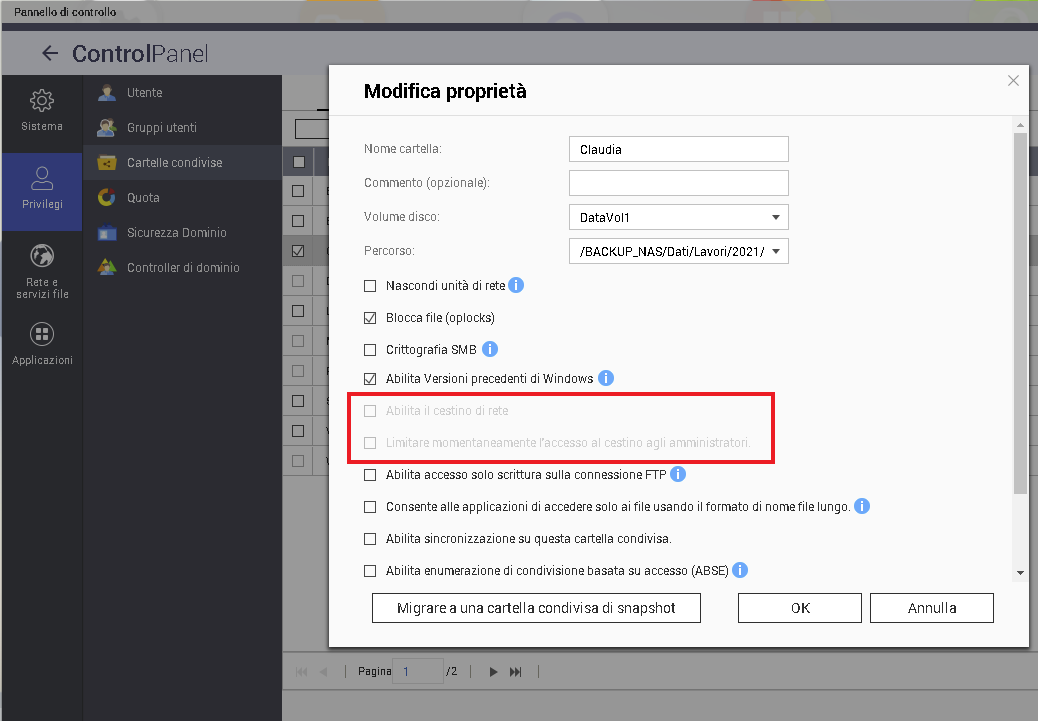 la schermata si trova in "Pannello di Controllo>Privilegi>Cartelle Condivise (modifica proprietà della cartella interessata).