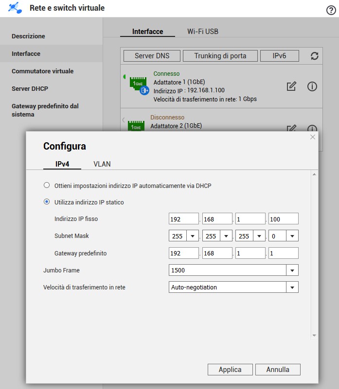 Niente provato a configurare la tua stessa rete velocità sempre uguale 12 MB/s. Sto avendo molte difficoltà’ nel trasferimento dei dati. Lentezza. Ho provato in quick access ma il nas improvvisamente si disconnette ad operazione non ultimata. Motivo sconosciuto. PcPiaNi ha scritto:Ti metto la mia configurazione di rete, se può essere di aiuto.