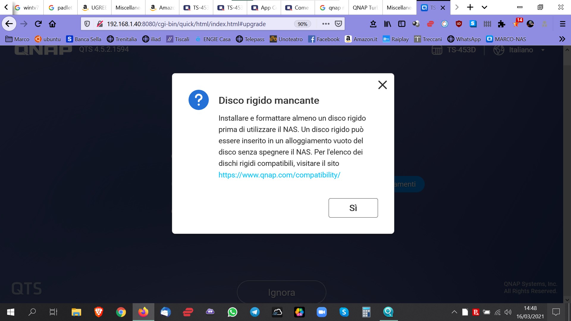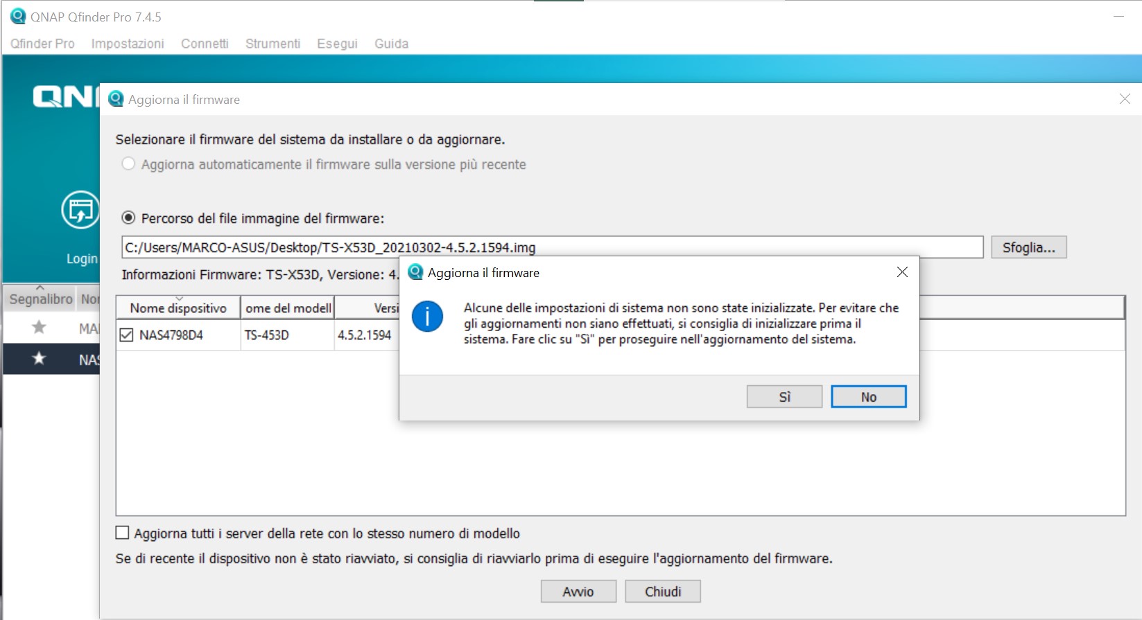 Ho provato a montare il nuovo NAS. Ho provato ad aggiornare il firmware con qfinder ma mi è comparso questo avvertimento