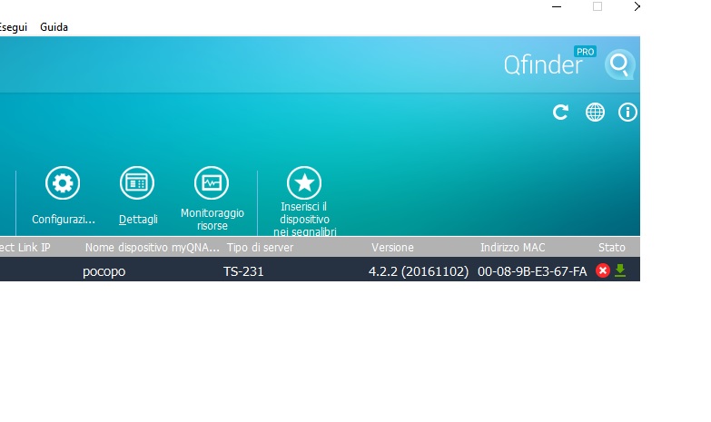 Qfinder: in configurazione normale (2 dischi dentro), rileva che è stato riscontrato un errore grave: si vede una X rossa e se ci si clicca sopra si viene inviati all'home page del NAS. Vi allego lo screenshot