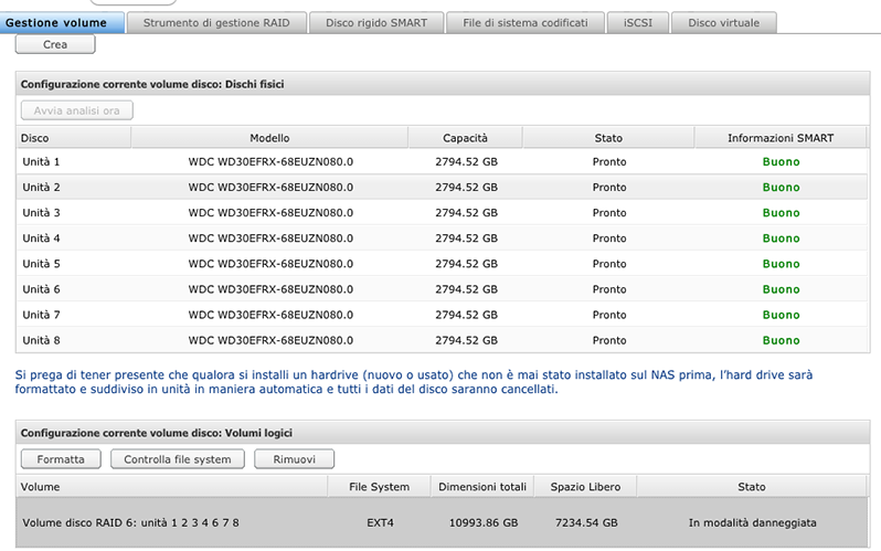 da qualche mese ho cambiato i vecchi HD WD da 2Tb con i nuovi WD da 3TB, uno degli hd ultimamente mi stava dando problemi di lettura, allora a Qnap spento l'ho sostituito con uno nuovo, ma da quando l'ho fatto il raid lavora in modalità danneggiata, ho dato un paio di volte la funzione controlla file system ma non cambia niente, c'è qualcosa che posso fare per uscire dalla modalità danneggiata?
