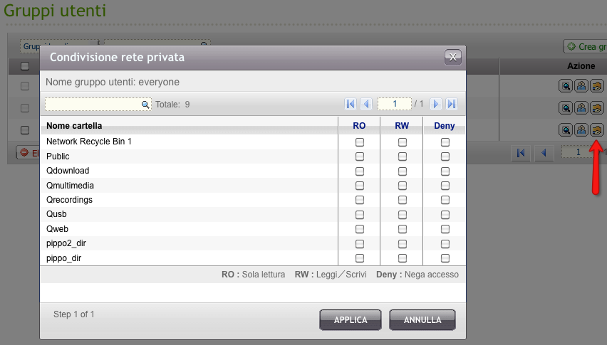 Buon sera. chiedo aiuto per il settaggio degli utenti ftp con un nap 439. Il problema è il seguente, ho creato dei nuovi utenti con identificazione della singola dir di accesso, bloccando di fatto l'accesso sulle altre cartelle. pippo accede solo alla cartella 1 perchè è l'unica che riesce a vedere e gestire.