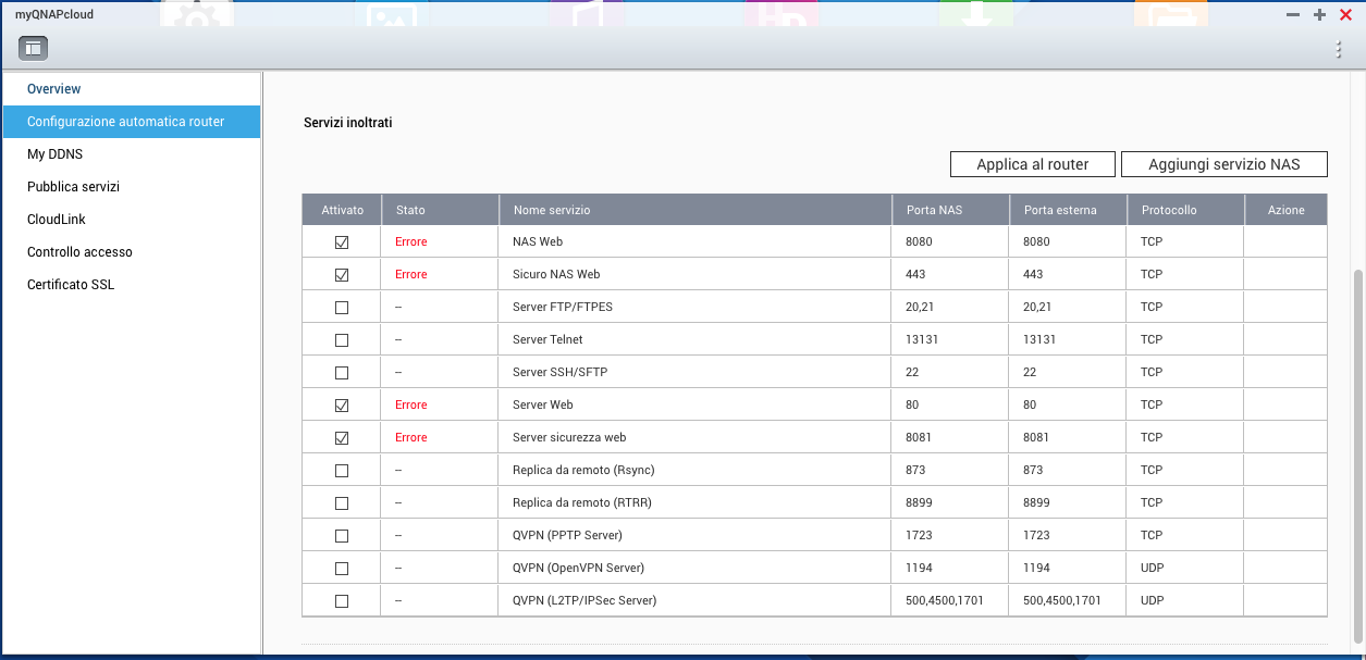 Lancia l'interfaccia del NAS e vai in MyQnapCloud e posta la schermata "Config. automatica router" (non contiene dati significativi per "rintracciarti", quindi lascia tutto visibile).