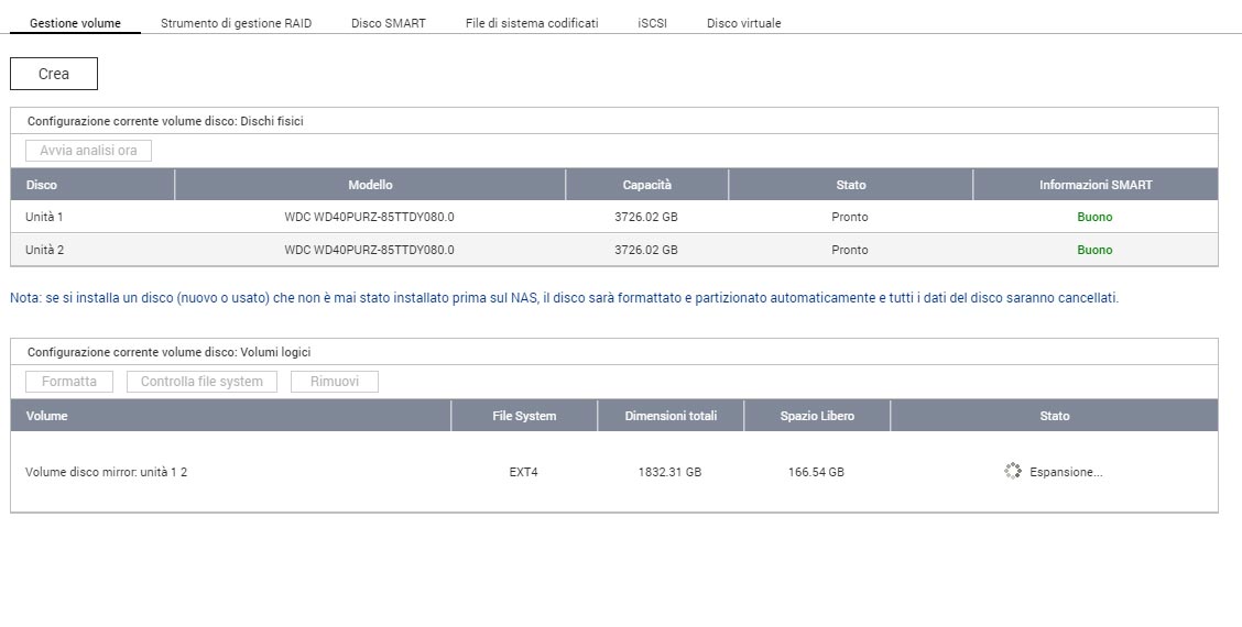 Salve ho un problema con TS-219P con firmware 4.3.3.0514 hdd 2TB in raid1. Uno dei due hd era guasto, l'ho sostituito con uno da 4TB, lo ha riconosciuto, ha ricostruito l'archivio in circa 10 ore, ho sostituito il primo funzionante da 2TB con un nuovo hd da 4TB, ha impiegato lo stesso tempo per la ricostruzione dell'archivio, e poi, ho proceduto all'espansione per utilizzare tutti i 4 TB. Dopo circa 3 giorni non aveva finito, ho scritto a qnap e mi hanno detto che non era possibile dicendomi di riavviare. L'ho fatto, ho fatto ripartire nuovamente la funzione espansione venerdì mattina e fino ad ora (lunedì 13,20) non ha anacora finito. E' normale? Per passare da 2 a 4 TB quanto tempo impiega? Grazie a quanti risponderanno.