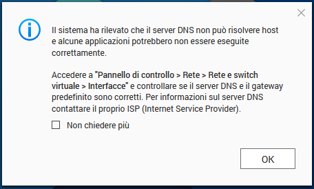 Quando effettuo l'accesso da browser a QTS Desktop mi compare un pop-up che mi avvisa che "il server DNS non può risolvere host" e di accedere a "Rete e switch virtuale > Interfacce" per controllare la correttezza di server DNS e gateway.