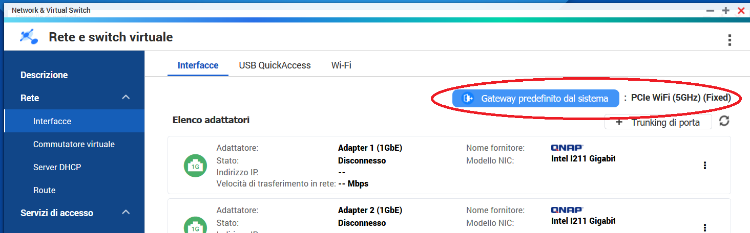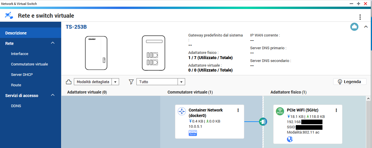 Accedendo a tale app, nella scheda "Descrizione" i campi Gateway, IP WAN, Server DNS primario e secondario risultano vuoti (primo campanello d'allarme), nella scheda "Commutatore virtuale" è comparso un "Container Network (docker0)" che non mi ricordo di aver mai notato o configurato (secondo campanello d'allarme), nella scheda "Adattatore fisico" compare la scheda di rete wireless con le impostazioni corrette (indirizzo IP statico, Subnet Mask, Gateway (indirizzo router di casa), DNS primario (indirizzo router di casa), DNS secondario (vuoto).