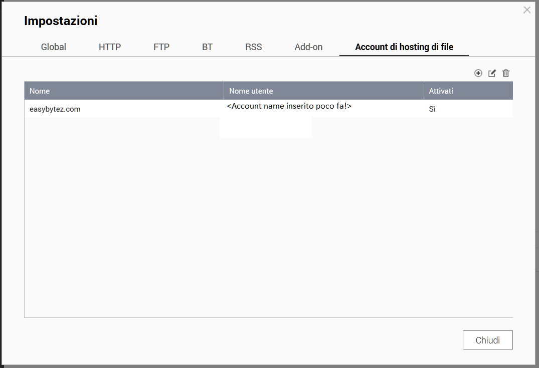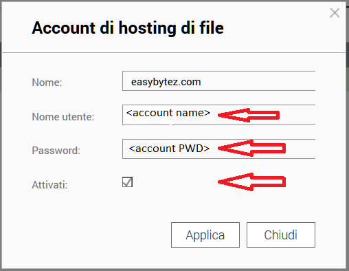 Su jdownloader funziona.. volevo provare la tua guida.. ma il nome utente e password va senza le <utente> o ci vanno?