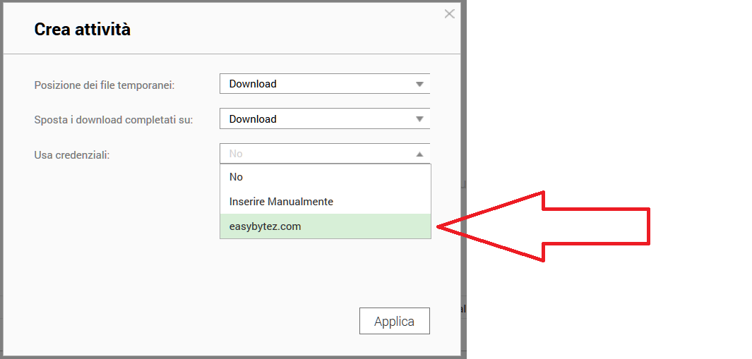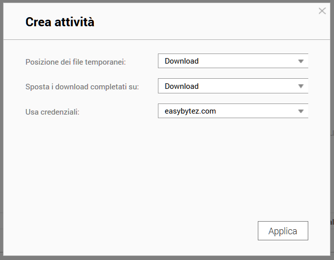 Dopo l'ultima fatica nel premere AVANTI, ora avrete la schermata BINGO, ovvero quella nella quale direte al nostro amato NAS in che modo scaricare i file precedentemente copiaincollati, selezionando dall'ultima casella a discesa la voce ovvero: