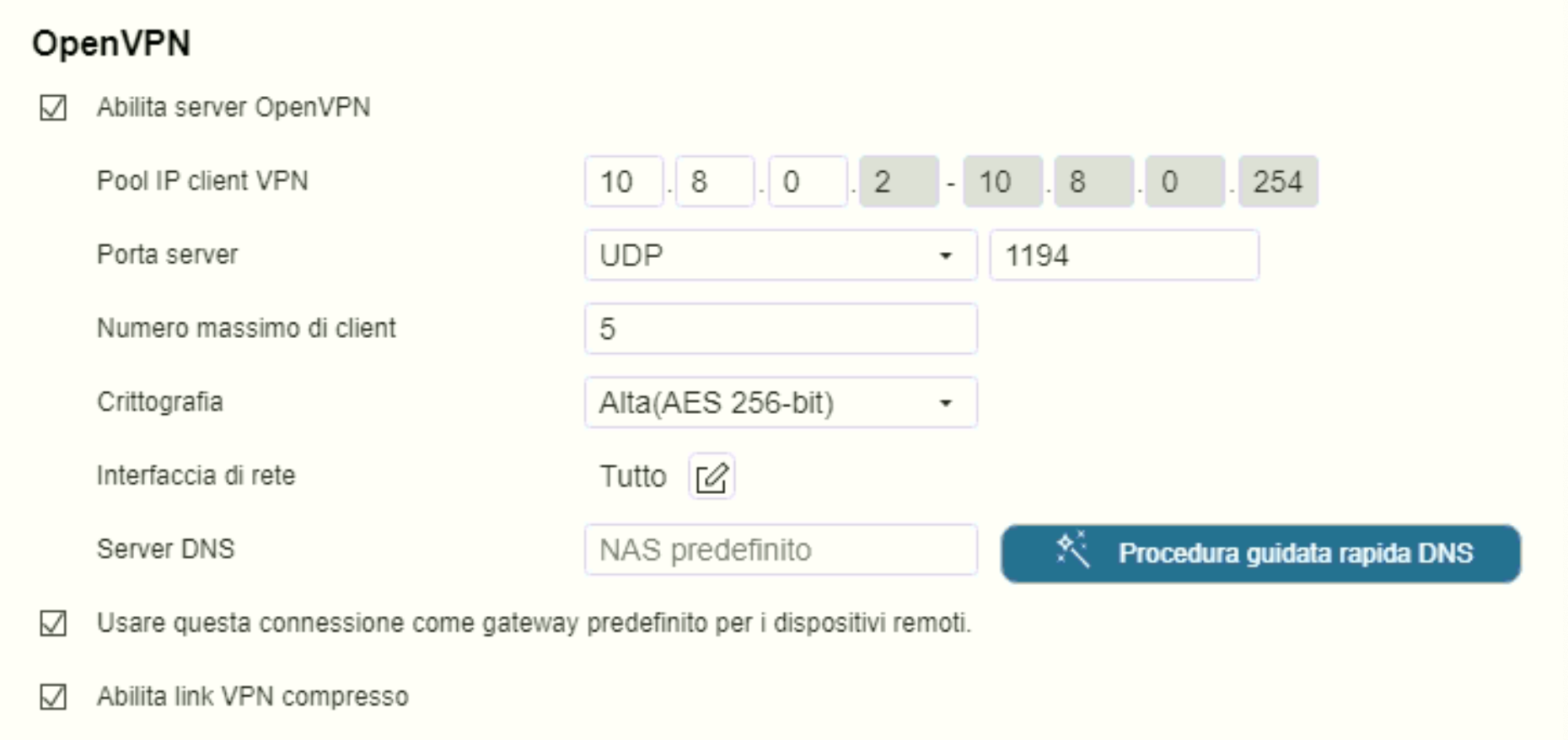 Consulting avrei una domanda per te. Riesci a navigare in internet con la VPN connessa? Avrei necessità di accedere anche alle risorse di rete in VPN ma il problemi principale è che gli utenti se hanno la VPN accesa non riescono a navigare su Internet. Ho disabilitato anche l'opzione "Usa gateway predefinito per connessioni remote" e si verifica la situazione opposta. VPN connessa, naviga su internet ma non vede il nas.consulting ha scritto: 14/04/2021, 16:27 Salve, ho abilitato OpenVpn sul TS-231P2, abilitato gli utenti e scaricato il client. Dopo essermi collegato con il client, se punto a \\10.8.0.1\condivisione mi si apre tranquillamente la cartella condivisione che è configurata sul nas. La mia necessità è di accedere ad una condivisione di un client della rete remota in cui è installato il QNAP che fa da server vpn, ovvero un pc con indirizzo 192.168.1.x. Se digito \\192.168.1.x\condivisione non mi si apre nulla, quindi credo di avere saltato un passaggio... mi potete aiutare? Ho provato con il tutorial sul sito QNAP e non mi pare di avere saltato nessun punto della configurazione ma a questo punto ho qualche dubbio. Grazie. In allegato screenshot della configurazione standard del nas