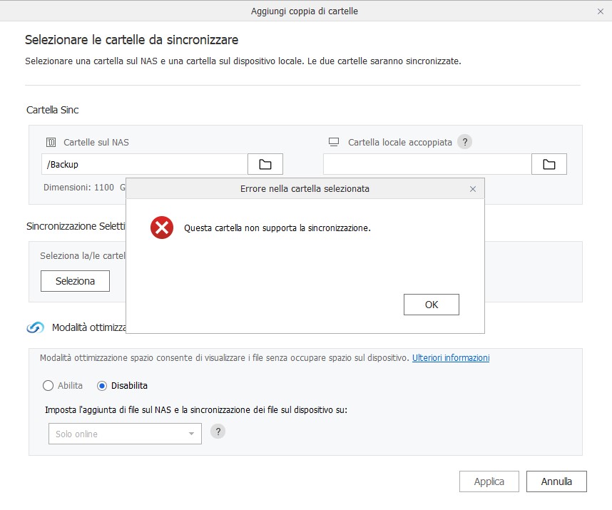 Buongiorno. Ho lo stesso identico problema, dopo una formattazione non mi fa più selezionare le cartelle che erano in sincronizzazione prima. Imposto la cartella condivisa sul NAS, ma quando vado a fare lo stesso con la cartella locale esce questo errore. La modalità ottimizzazione spazio è disabilitata. Certo che potrebbero dare qualche indizio sulla causa dell'errore......