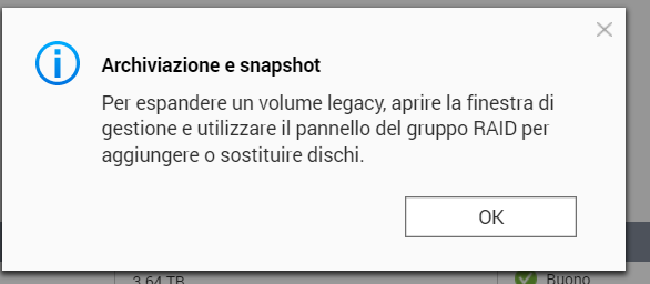 No, una volta sostituiti, devi espandere il volume…alexflibero ha scritto:Buongiorno ho un Qnap TS xxxxx, attualmente utilizzo 4 dischi WDRed da 3TB in RAID 5 ma lo spazio stà per esaurirsi per cui avrei pensato di estendere la capacità sostituendo, uno per volta, i dischi da 3TB con modelli da 4 o 6 TB. Sostituendoli uno a uno e attendendo la ricostituzione del volume ogni volta, la capacità si espande d sola o rimane la stessa ?