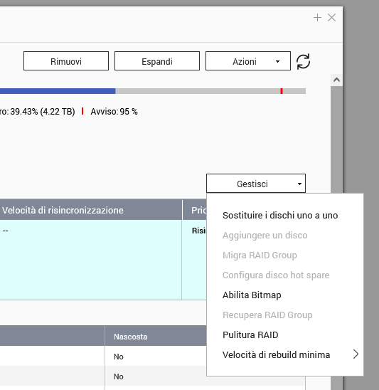 In archiviazione e Snapshot, scegli il tuo gruppo Raid da espandere ed in alto a destra clicca su Gestisci.