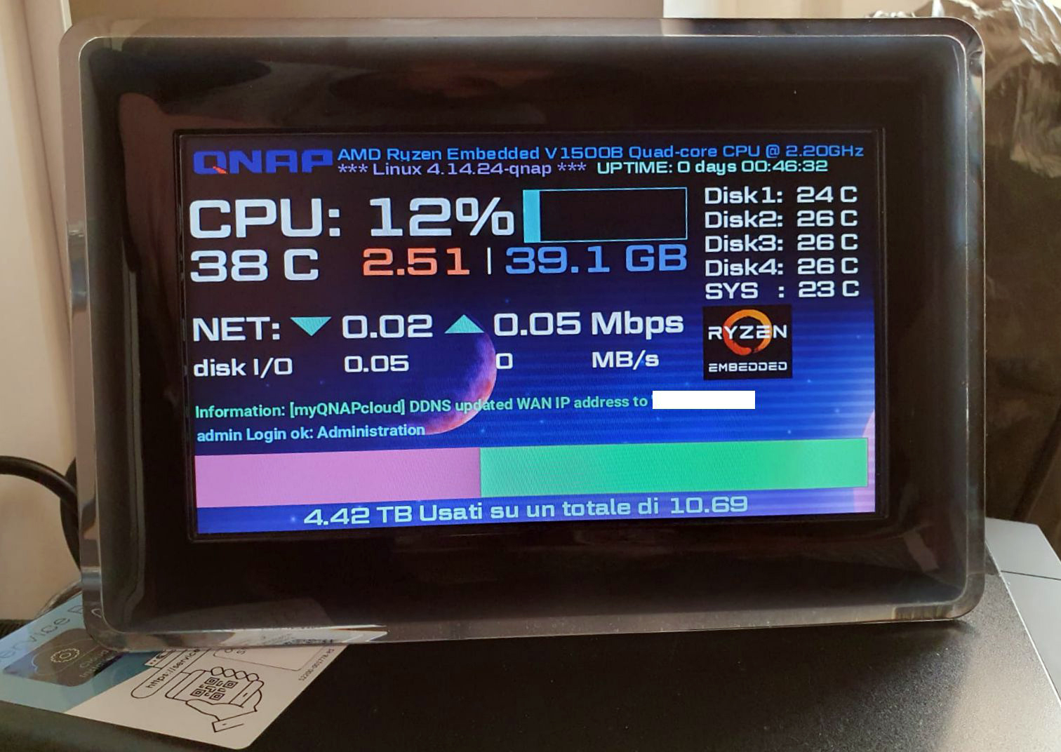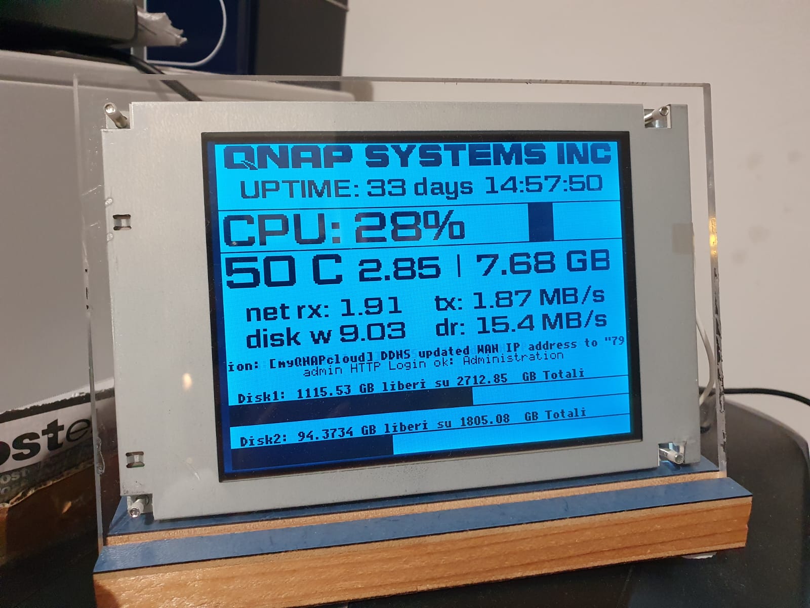 Sperando di fare cosa gradita a qualche vecchio nerd come me vi allego la versione di lcd4linux presa da questo fork https://github.com/TangoCash/lcd4linux (pensata per decoder enigma2) compilata nativamente per x86_64 (glibc 2.21) che supporta svariati display grafici in più rispetto a quella presente nel repository di ENTware (tra cui molte foto cornici digitali samsung SPF-72H, SPF-75H, SPF-76H, SPF-83H, SPF-83M, SPF-85H, SPF-85P, SPF-86H, SPF-86P, SPF-87H, SPF-87H-v2, SPF-105P, SPF-107H, SPF-107H-v2, SPF-700T, SPF-1000P] ed ha inoltre un widget per il supporto dei font truetype su displa grafici, in allegato il mio (ho anche un samsung a colori su un altro nas), c'è anche il plugin QNAP funzionante.