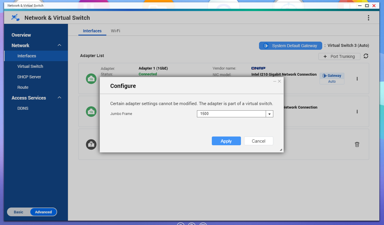 Ho il modello ts- 451+, ho provato a vedere in "rete e switch virtuale" aspettandomi una impostazione simile a quella di una scheda di rete su un PC Windows ma invece nulla.