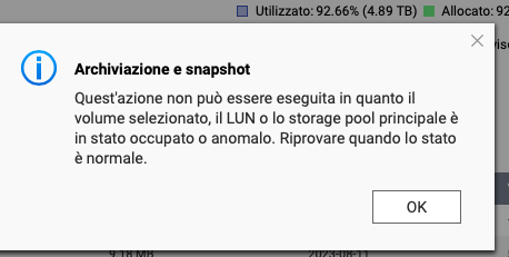 Questa è la mia situazione. Mi sembra di capire che il mio RAID non stia usando tutto lo spazio disponibile: ho provato anche ad aumentarlo con il comando Ridimensiona volume ma ho il seguente errore: Avete idea su come posso risolvere?