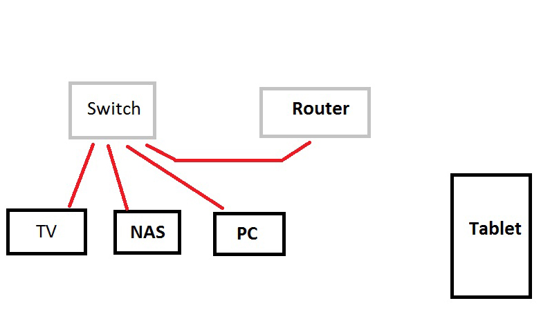 la tv, il portatile, il qnap, e il router sono collegati allo switch, allo stato attuale tv, poratile, e qnap si vedono, il tablet invece non vede ne la tv nel qnap, se la tv e il qnap li attacco al router riesco a fare funzionare tutto, ma lo scambio dati col pc passa dai 45mb/s a 5.......